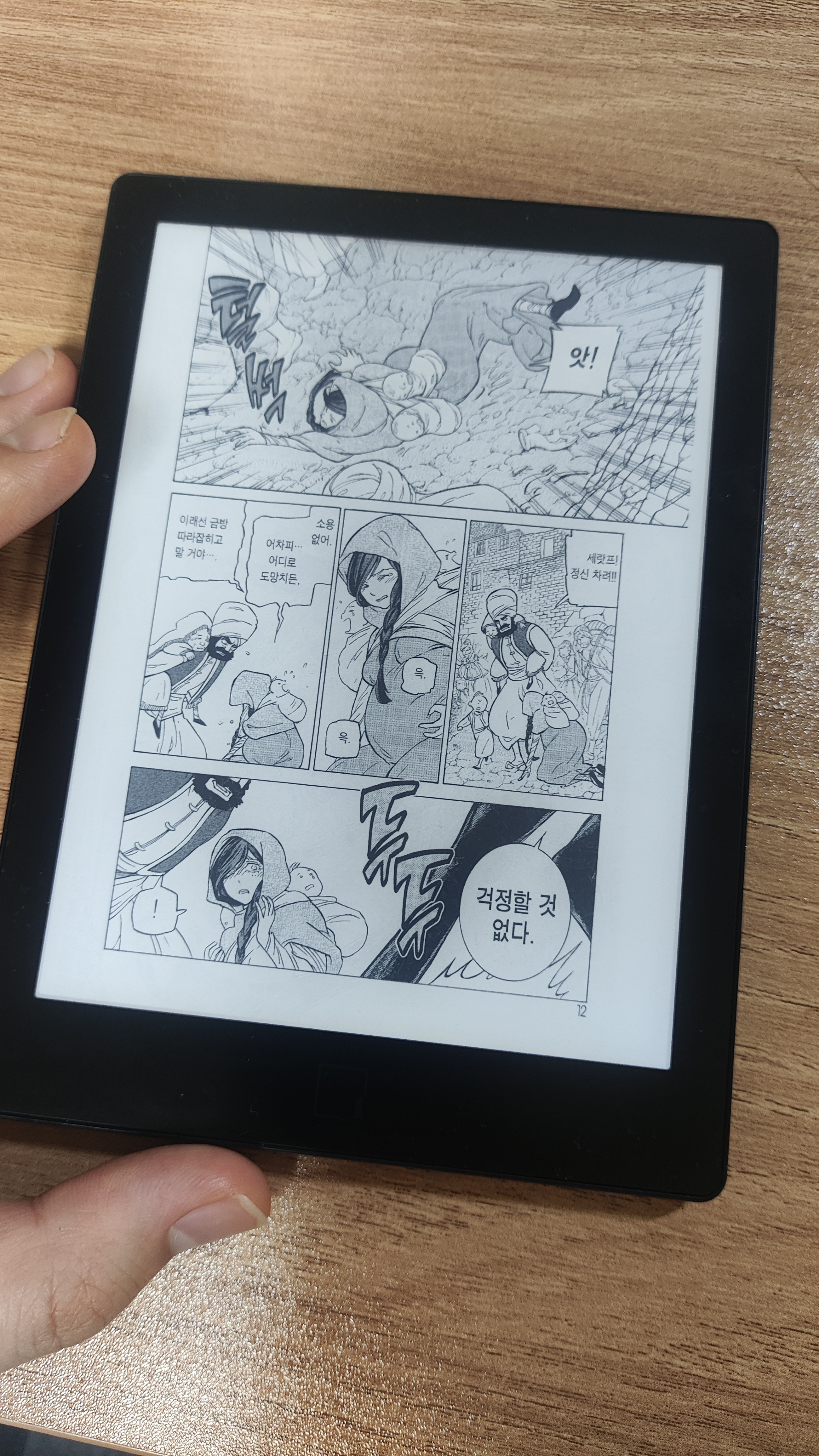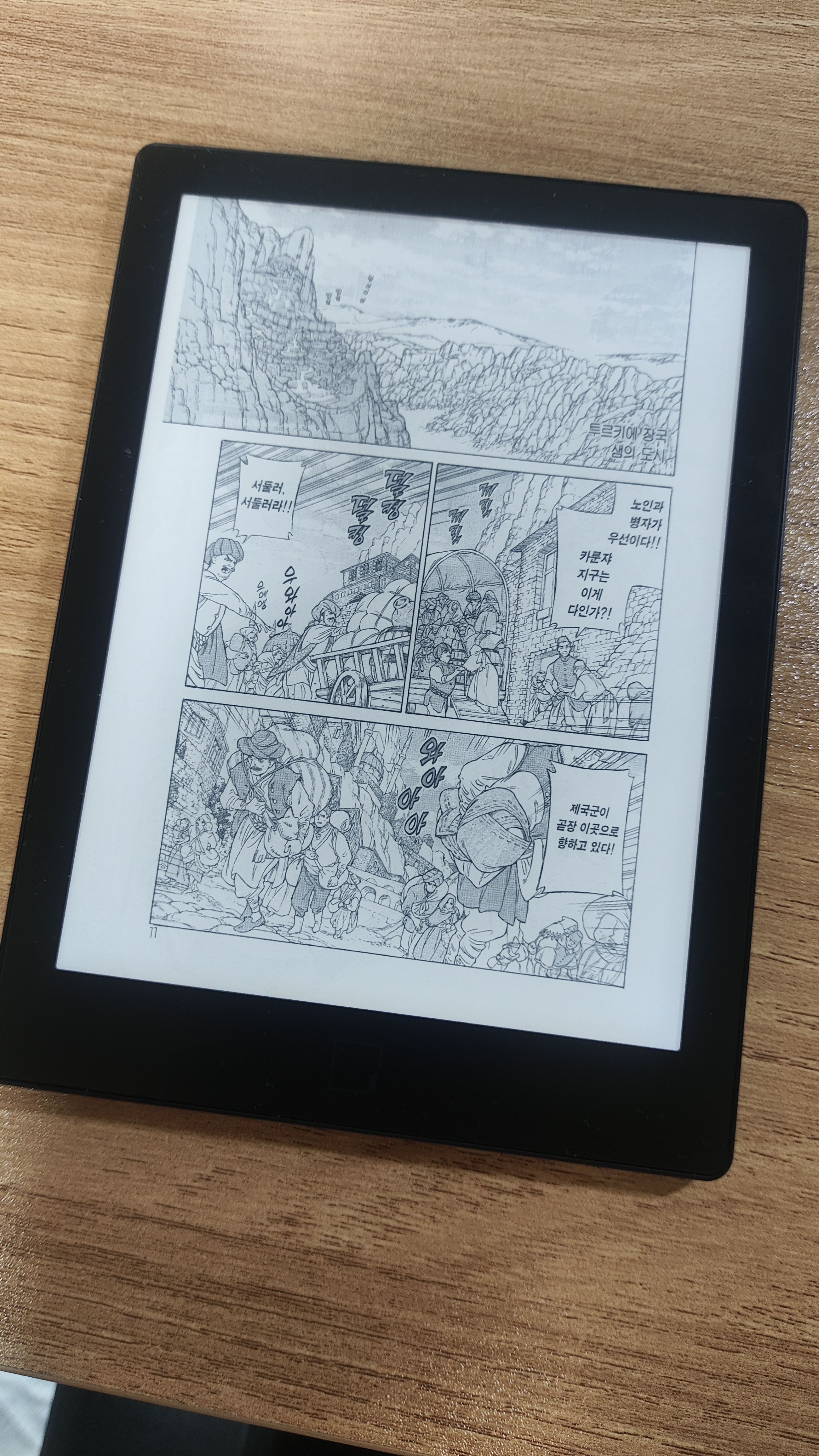 글자 뿐 아니라 그림을 보는데도 300PPI 디스플레이의 강점이 돋보입니다. 212PPI 디스플레이를 채택한 여타 기종들은 그림을 보는데 어려움을 겪을 수밖에 없습니다. 하지만 루나x는 선명하기 때문에 만화책을 읽어도 화질 문제로 불편하지는 않을 것입니다. 필자는 사실 6인치 단말기는 만화를 보기 어렵다고 생각하고 별 기대를 하지 않았습니다. 그런데 이게 웬걸, 가독성이 나쁘지 않았습니다. 만화책을 띄었을 때 글자가 흐릿하거나 그림이 선명하지 않을 것이라고 생각한 것은 필자의 편견이었습니다. 그림도 글도 제대로 식별 가능합니다. 다만 묘사가 세밀하고 글자가 작고 많은 장면에서 눈이 아플 수 있다고 생각되긴 합니다.