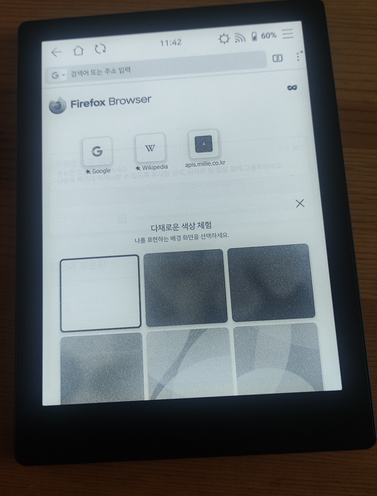 기본적으로 화면은 사진에서 보이는 바와 같이 위젯 하나와 8개의 버튼으로 이루어져 있습니다. 자세한 설명은 ‘사용안내’를 클릭하면 볼 수 있습니다. 전자사전은 WIFI 연결이 필수입니다. 사실 전자사전 앱이라기 보다는 네이버 사전, 지식백과에 곧바로 검색할 수 있는 검색창을 제공하는 것 뿐이라서 기기에 맡게 최적화 된 앱은 아닙니다. 내장 브라우저는 E-ink 전용 브라우저는 아닙니다. 그냥 파이어폭스 브라우저를 가져다 쓴 듯합니다. 그 결과 최적화가 썩 좋지 않습니다. 처음 수령했을 때 내장 브라우저로 파일을 다운로드 받으려고 했는데 계속 실패를 해서 결국 컴퓨터와 연결하여 apk파일을 다운로드 할 수 있었습니다. (다만 왠지 모르겠으나 며칠 뒤 다운로드를 다시 시도했을 때 내장 브라우저가 제대로 동작했습니다. 아무래도 처음에 제가 잘못 건든 탓에 다운로드가 안 된 것인지 의심스럽습니다.) 뮤직 앱은 특별한 건 없고 블루투스 이어폰으로 연결해 들어본 바 잘 작동합니다.
